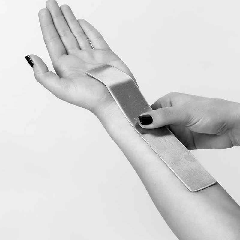 - Få hjelp av helsepersonell til å tilpasse aluminiumsskinnen slik at den følger håndleddets form helt.
