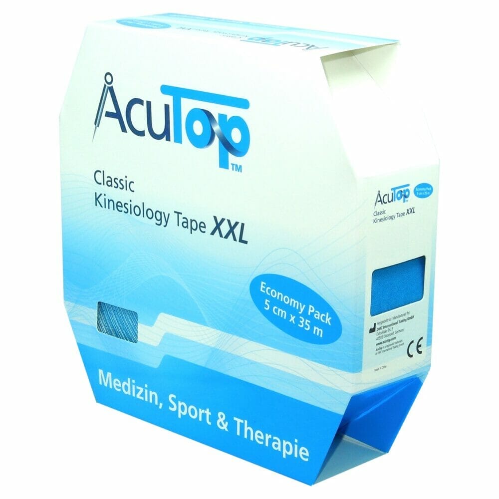 Kinesiotape XXL, med sin lengde på 35 meter, tilsvarer 7 individuelle 5 meter ruller med klassisk kinesiotape. Kinesiologitape XXL er derfor ideell for klinikker eller fysioterapeuter som bruker tapen til behandling og derfor går gjennom mange ruller i løpet av en dag. Den smarte plassbesparende oppbevaringsboksen og lengden sørger for at du sparer tid mellom bruk.